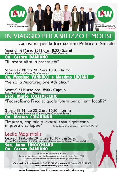 Sabato 3 marzo c'è stata la conferenza stampa, presso la sede del PD di Vasto, per la presentazione del Corso di formazione politica dell'Associazione politica "LAVORO&WELFARE". Il Corso, dal titolo "In viaggio per l’Abruzzo ed il Molise: carovana di formazione politica e sociale", prenderà il via venerdì 16 marzo a Scerni. Gli altri appuntamenti saranno: sabato 17 marzo a Termoli, venerdì 23 marzo a Cupello, sabato 31 marzo ad Isernia, giovedì 12 aprile a San Salvo.
