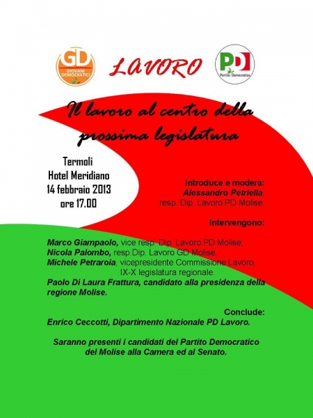 Il dipartimento lavoro del Partito democratico del Molise, unitamente a quello dei Giovani Democratici del Molise, terrà oggi pomeriggio alle ore 17, presso l'Hotel Meridiano di Termoli, un incontro dal titolo "Il lavoro al centro della prossima legislatura".